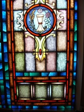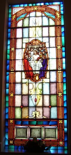 Hand-stained glass window with a Biblical scene medallion of "The Last Supper"