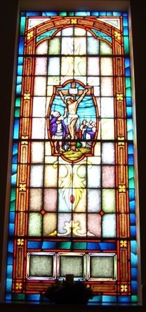 Hand-stained glass window with a Biblical scene medallion of "The Crucifixion"
