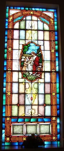 Hand-stained glass window with a Biblical scene medallion of "Blessing the Little Children"