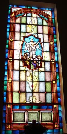 Hand-stained glass window with a Biblical scene medallion of "The Ascension"