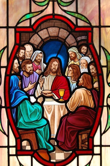 Opalescent glass window with 20" x 32" hand-stained glass medallion depicting the "Last Supper" and a memorial plate