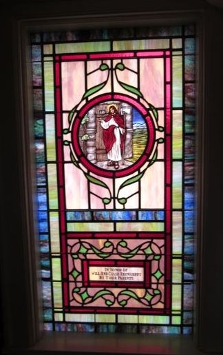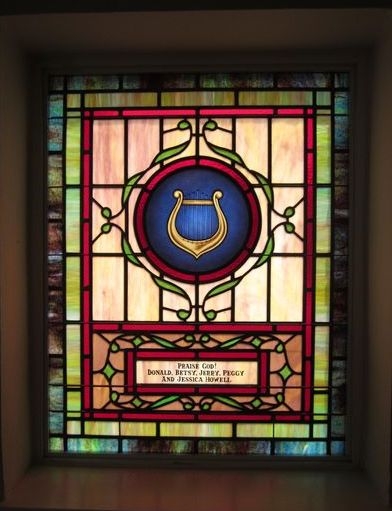 Opalescent glass window with a 20" x 32" hand-stained glass medallion and a memorial plate