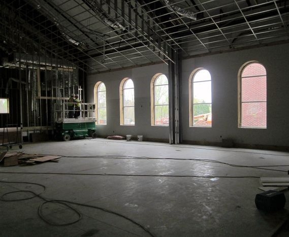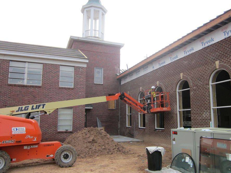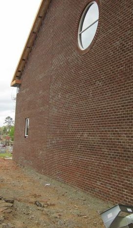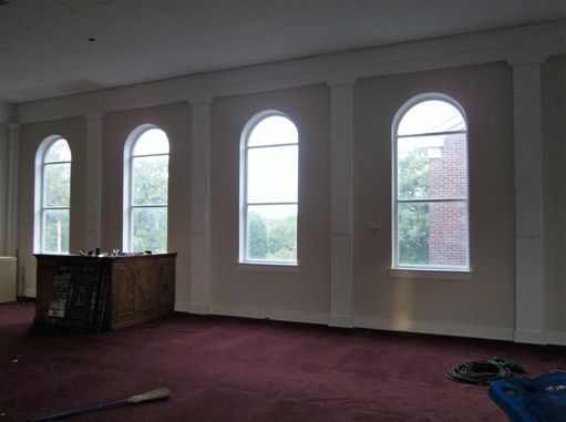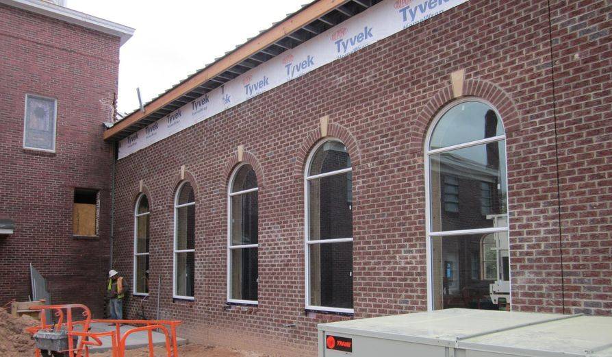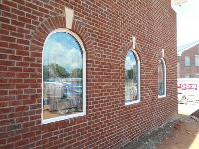This photo shows where the old white aluminum frames have been re-installed and the brick masons have laid their brick to them, ensuring a tight fit. Now, the worker is examining the frames before he installs the 5/8" Insulated Glass Units which are in view at the lower right hand corner.