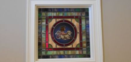 Opalescent glass window with a 12" round symbol and a memorial plate
