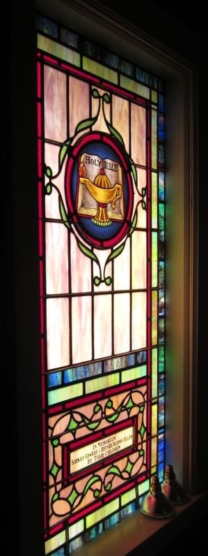 Small opalescent window with a custom 12" symbol (note the low lighting)