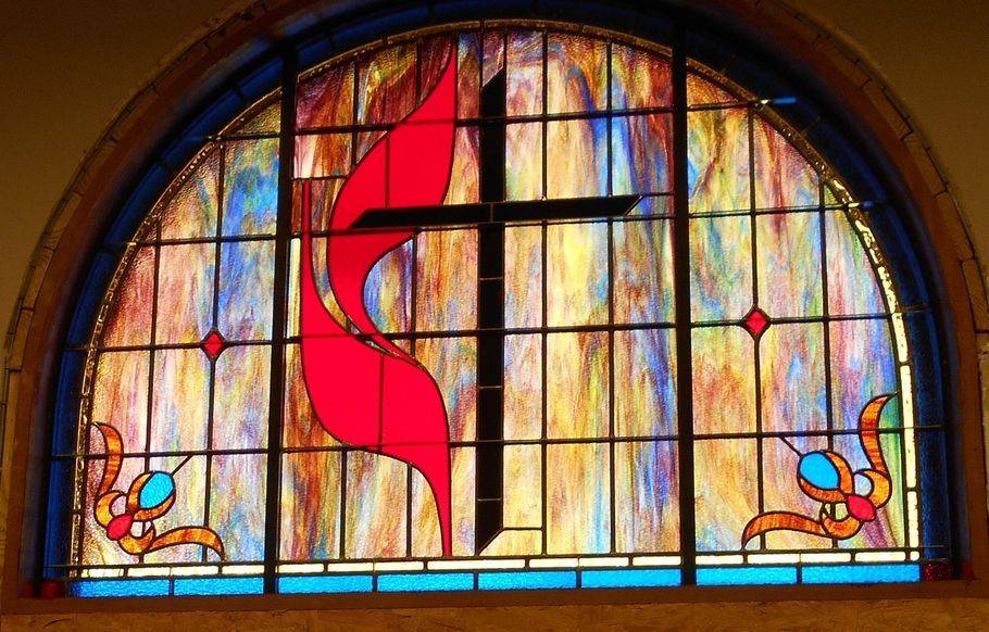 Transom window with cut-in United Methodist Church symbol over the entrance doors set into a wood frame