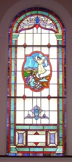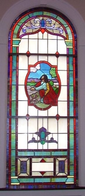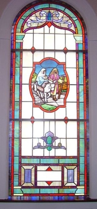 Opalescent glass window a 18" x 26" medallion with a Biblical scene and memorial plate at the bottom