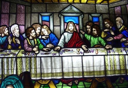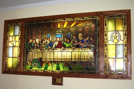 Light box window behind the altar. This is a hand-stained pictorial glass window of "The Last Supper."