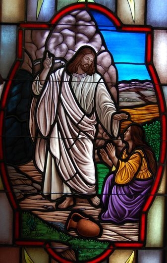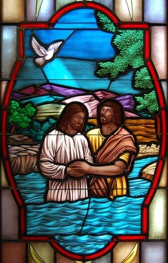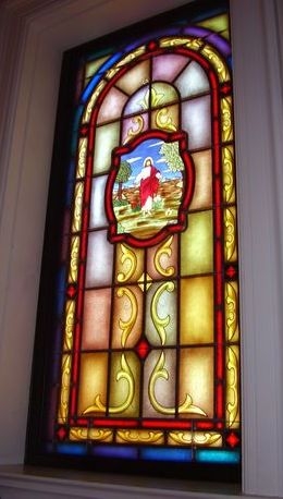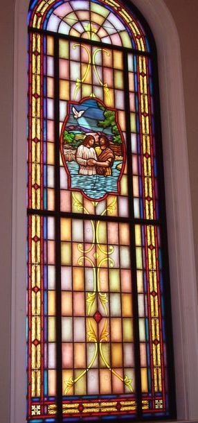 Hand-Stained glass window with a 28" x 42" medallion with the scene "Baptism"