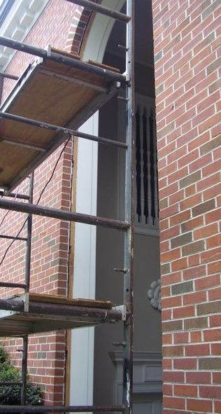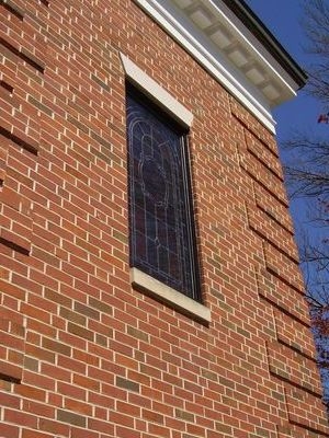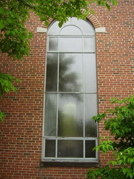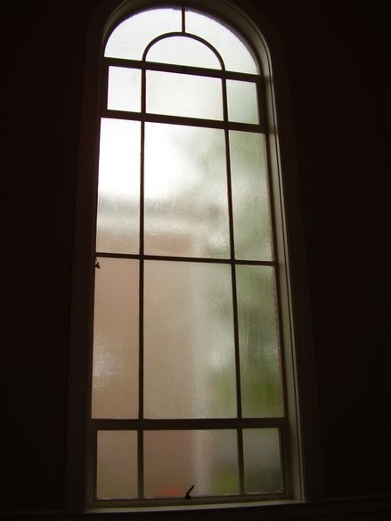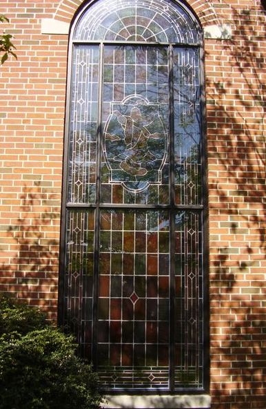 In 2014, Laws Stained Glass Studios returned and installed two windows (size 48" x 88"). These windows did not contain stained glass because they are not seen from the inside. They just contained dark bronze aluminum angle frames and 1/4" grey tinted Acrylite to help match the other windows.