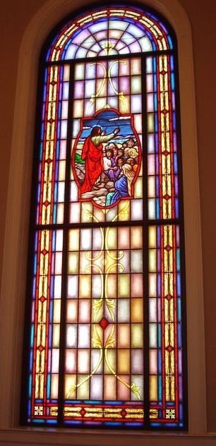 Hand-Stained glass window with a 28" x 42" medallion with the scene "Sermon on the Mount"