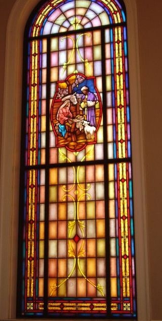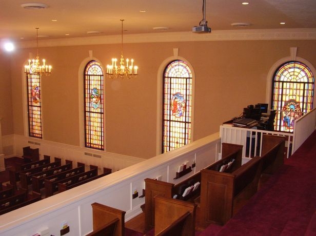 In 2009, Laws Stained Glass Studios installed (10) stained glass windows at the First Baptist Church in Sylva, NC. All of the windows are hand-stained and leaded. Eight of the windows measured 61" wide by 182" high with a round top. Each of these windows had a 28" x 42" medallion depicting a scene from the "Life of Christ" series. The two smaller windows measured 33" x 66 and contain a 12" x 15" one-piece medallion with a biblical scene.
