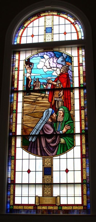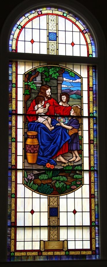 From 2001 to 2003, Laws Stained Glass Studios installed (16) opalescent glass windows at First Baptist Church in Tallapoosa, GA. The ten large windows (size 60" wide x 164" high with a round top) each contained a large 38" x 85" pictorial scene made of hand-stained glass. The scenes depicted the life of Christ. Up the middle of the window and in the middle border, hand-stained tracery glass was designed. The windows were designed by Laws' designer Vincent Ketchie. The windows were cartooned and painted by Laws' artists, Nina Haynes and Teresa Nash. The three round windows (28" diameter) did not contain artwork. One transom (size 72" wide x 10" high) contained the church's name, and the two small transoms (size 48" wide x 10" high) did not have artwork.